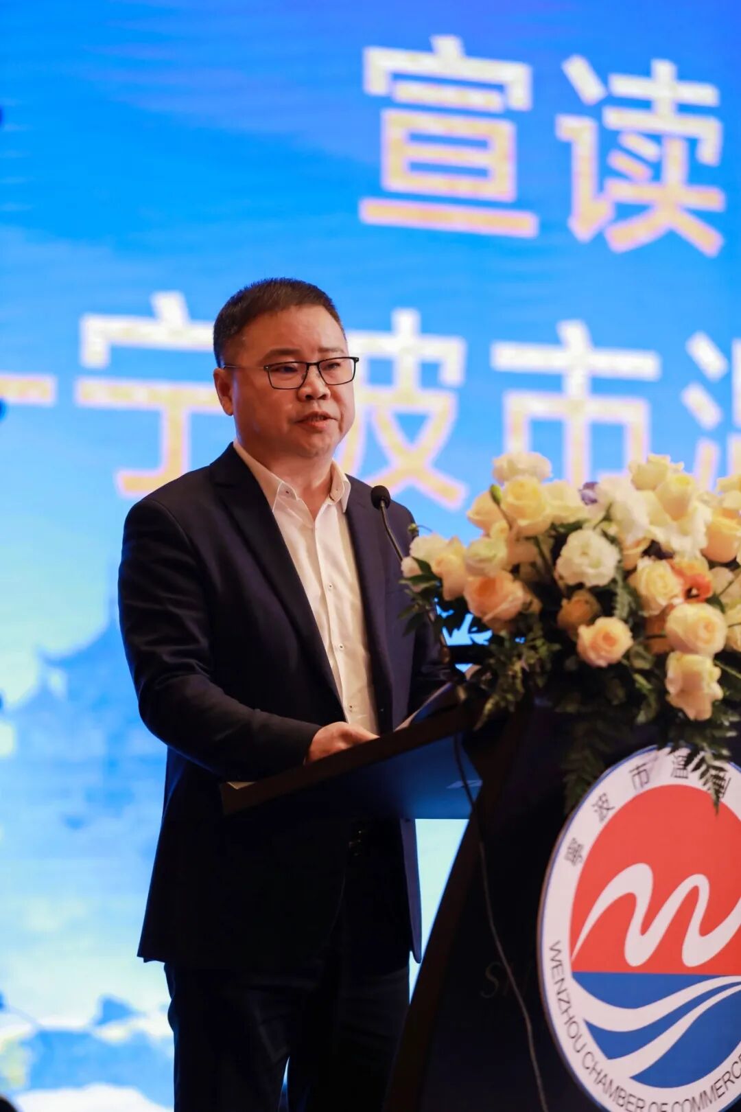 (联席会长陈国成宣读《清廉筑同心 护航新发展——宁波市温州商会致全体会员企业倡议书》)