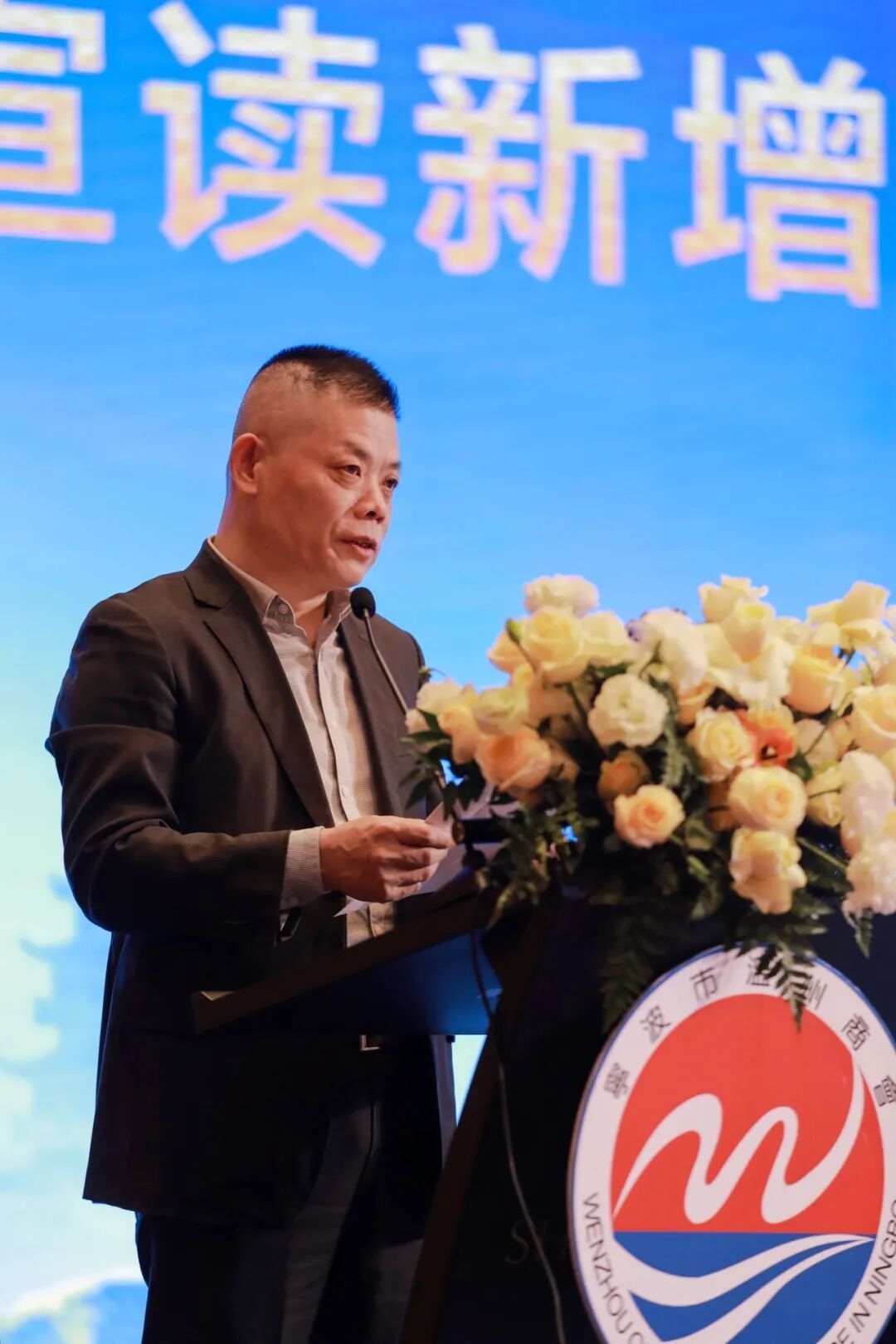 (联席会长陈国成宣读《宁波市温州商会2023年度优秀会员名单》)