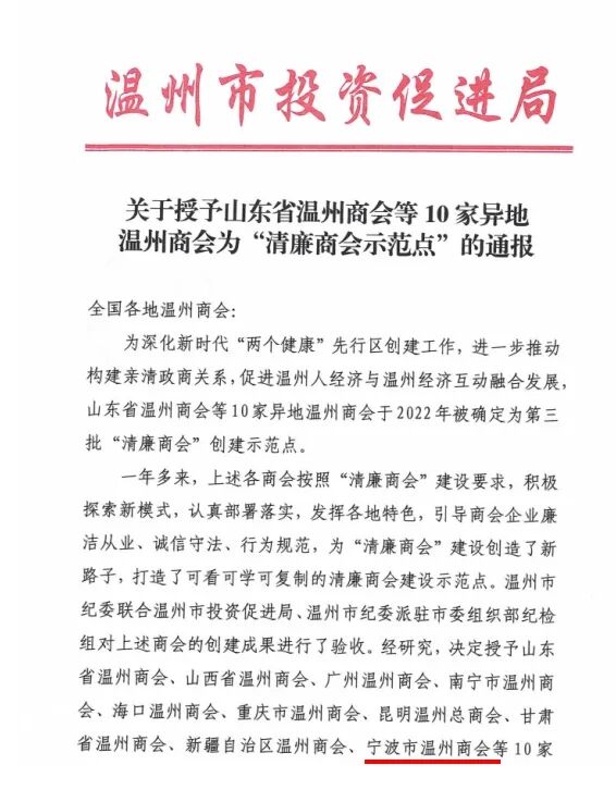 喜报丨热烈祝贺宁波市温州商会获评“2023年度宁波市工商联清廉商会创建示范单位”称号、被温州市投资促进局授予“清廉商会示范点”