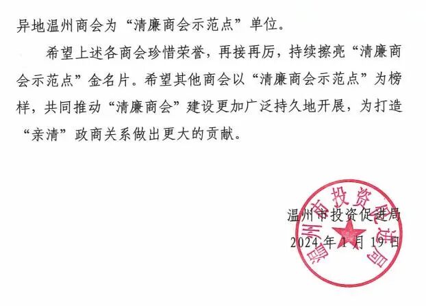 1月19日,温州市投资促进局发布通报,授予山东省温州商会等10家异地温州商会“清廉商会示范点”称号,以引导全国各异地温州商会进一步深化新时代“两个健康”先行区创建工作,进一步推动构建亲清政商关系,促进温州人经济与温州经济互动融合发展。