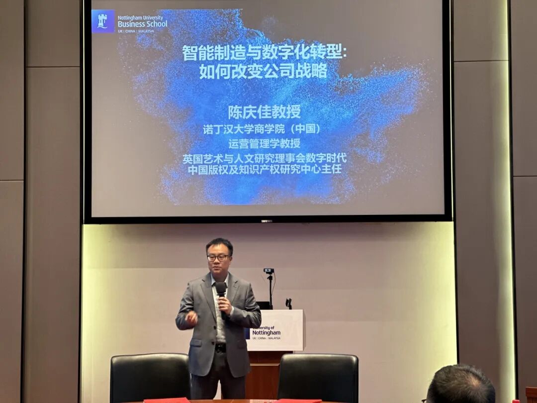 随后,诺丁汉大学商学院(中国)运营管理学教授陈庆佳为大家作《智能制造与数字化转型——“如何改变公司战略”》主题讲座。陈庆佳教授专注智能制造和生产管理研究领域,连续多年入选“全球前2%顶尖科学家名单”之“终身科学影响力排行榜”以及“中国高被引学者”榜单。近年来,承担多项国际、国家、省、市级纵横向科研项目,获得多个发明专利。