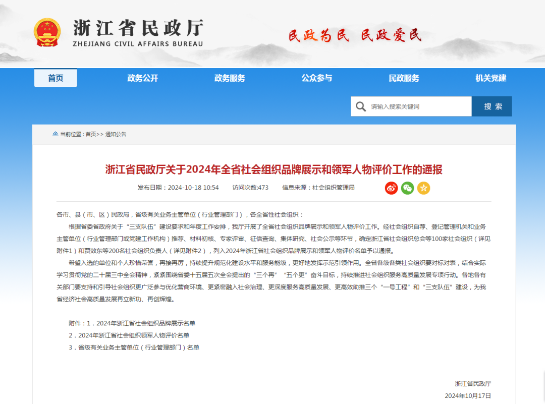 根据省委省政府关于“三支队伍”建设要求和年度工作安排,浙江省民政厅开展了全省社会组织品牌展示和领军人物评价工作。经社会组织自荐、登记管理机关和业务主管单位(行业管理部门或党建工作机构)推荐、材料初核、专家评审、征信查询、集体研究、社会公示等环节,最终确定100家社会组织和200名社会组织负责人,列入2024年浙江省社会组织品牌展示和领军人物评价名单予以通报。