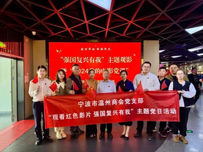 为庆祝中华人民共和国成立75周年,深入学习贯彻党的二十大精神,传承红色基因,弘扬革命精神,厚植爱国爱党情怀,增强民族自豪感和自信心。2024年10月10日下午,宁波市温州商会党支部组织党员、部分会员共同开展“观看红色影片 强国复兴有我”主题党日活动。
