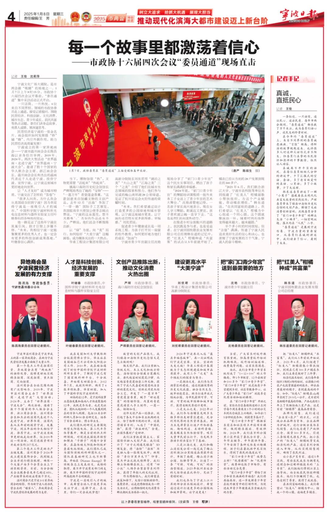 2025年1月10日上午,宁波市政协十六届四次会议圆满完成各项议程,在宁波文化广场大剧院胜利闭幕。省委常委、市委书记彭佳学讲话,中共宁波市委、市人大常委会、市人民政府领导汤飞帆,宁波市人大常委会主任、党组书记张平,宁波市委副书记、市委政法委书记张丽等在主席台就座。宁波市政协主席、党组书记陈龙主持大会。会议审议通过《关于全面深化工业用地整治 重塑产业空间格局的建议》作为市政协十六届四次会议全会提案,审议通过市政协十六届四次会议决议。
