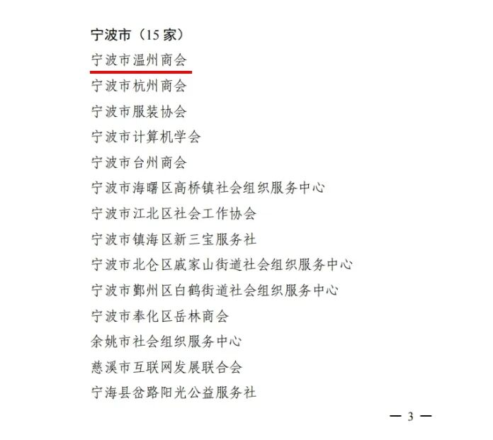 浙江省民政厅发布《关于公布浙江省清廉社会组织建设百家范例(第二批)名单的通知》文件,宁波市温州商会获评浙江省清廉社会组织建设百家范例。